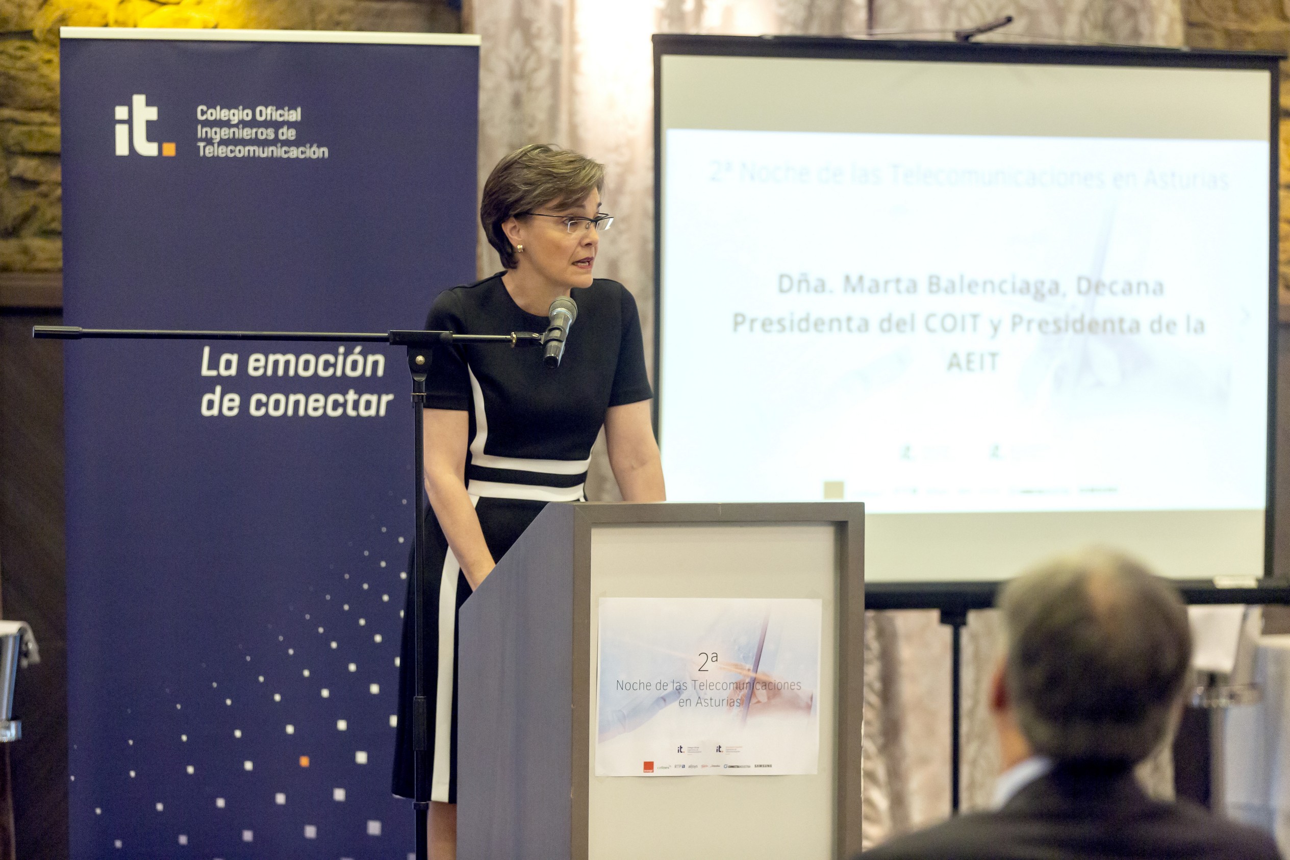 Para finalizar, Dña. Marta Balenciaga Arrieta, Decana Presidenta del Colegio Oficial de Ingenieros de Telecomunicación y Presidenta de la Asociación Española de Ingenieros de Telecomunicación felicitó también a los premiados y afirmó que el avance hacia la digitalización global es imparable, y que tanto en Europa como en España se han dado grandes pasos para ello. La figura del ingeniero de Telecomunicación resulta imprescindible para lograr esta digitalización global y está presente en ámbitos tan importantes como el energético, clave en estos momentos en Asturias, que pasará de una dependencia energética de combustibles fósiles a un modelo basado en energías limpias.